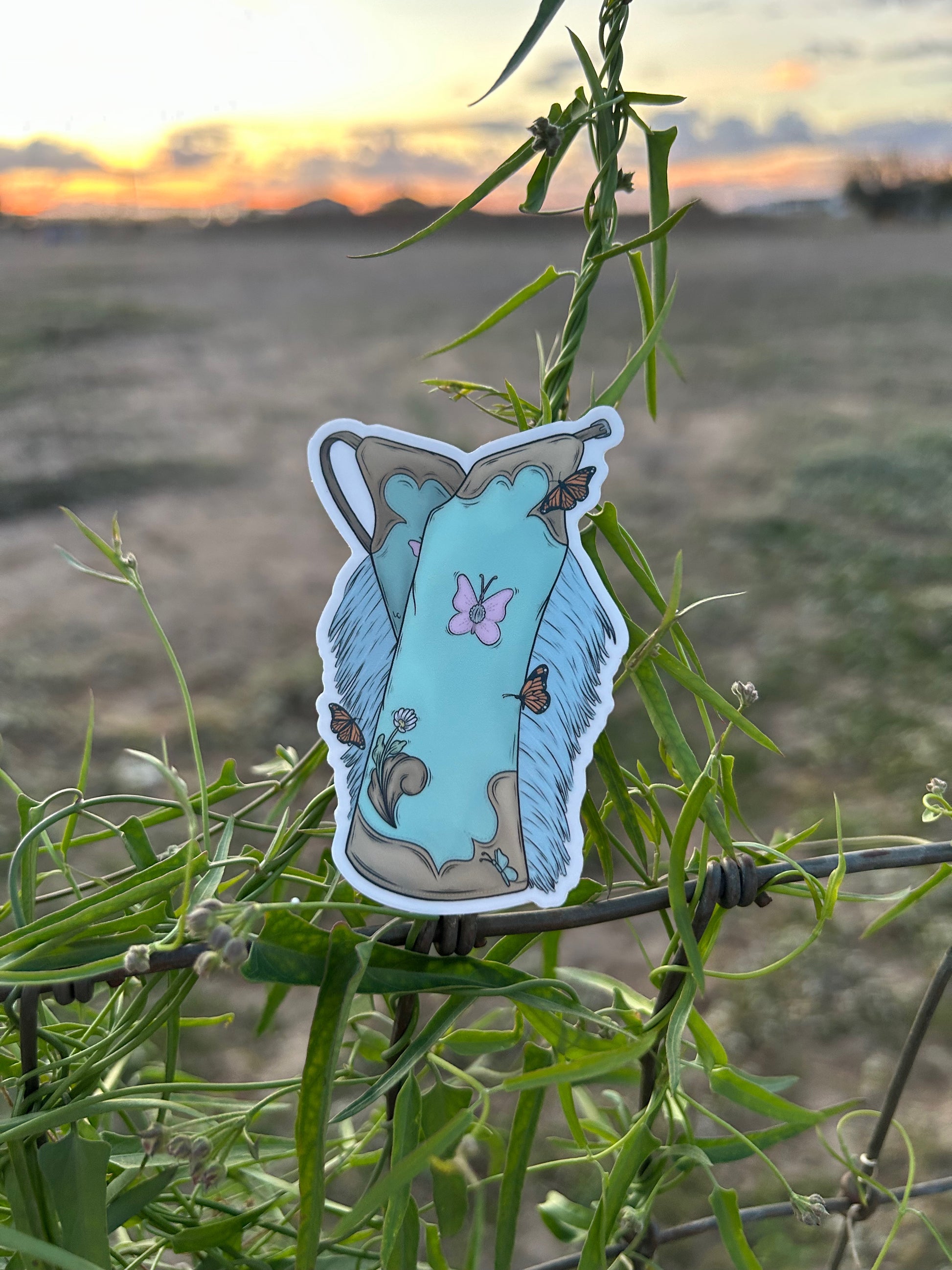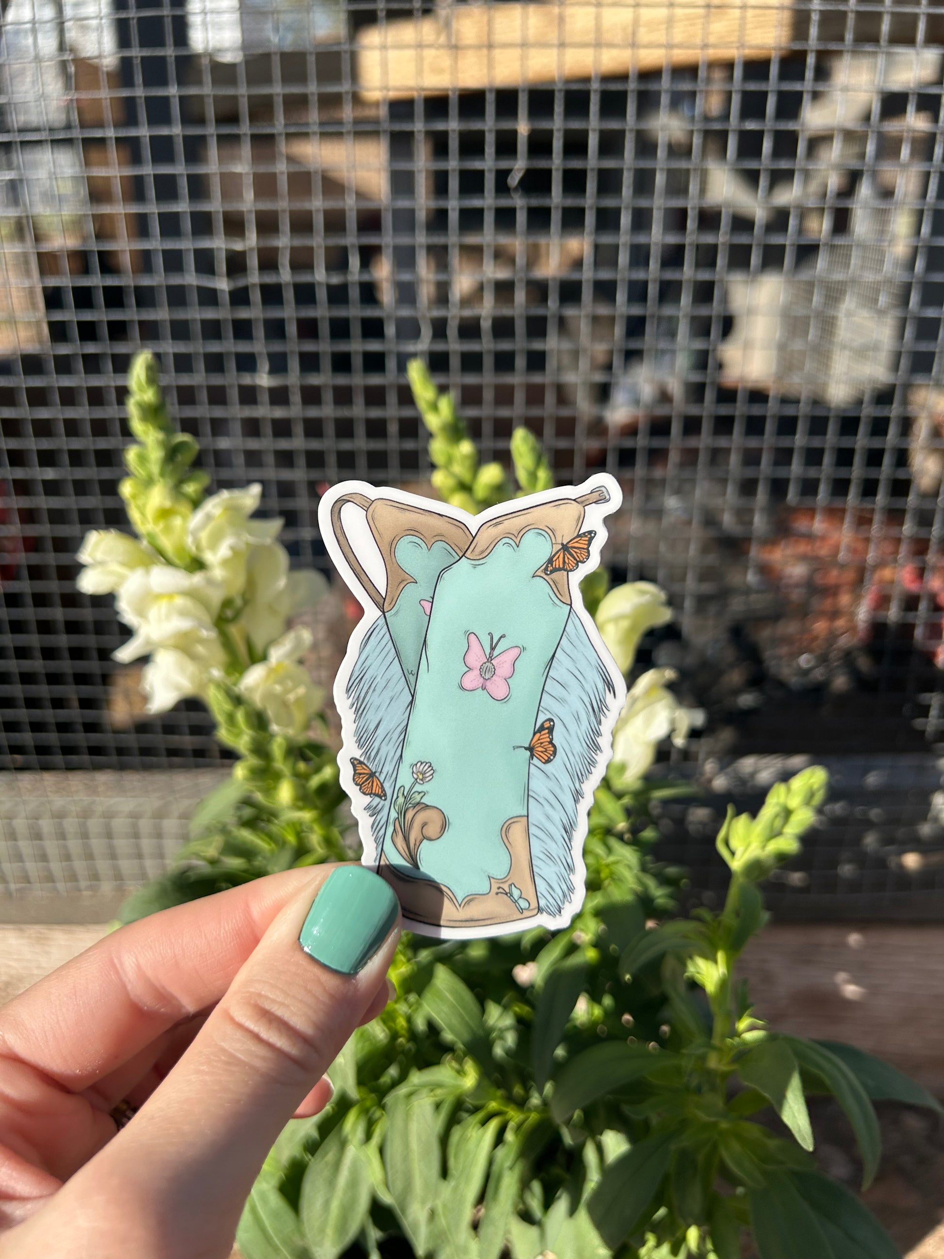2 inch x 3 inch waterproof vinyl sticker featuring blue leggings covered in butterflies.